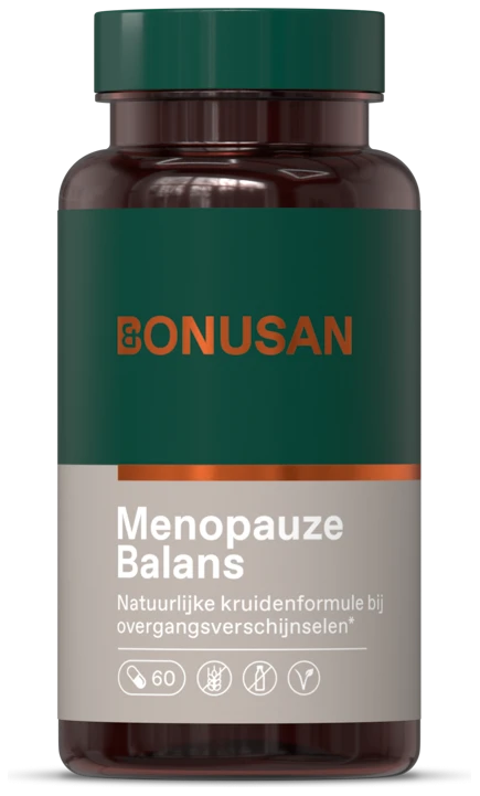 Tijdens de menopauze verandert de balans tussen progesteron en oestrogeen. Door de verandering in deze hormoonbalans kunnen overgangsverschijnselen optreden zoals opvliegers. Bonusan Menopauze Balans helpt bij overgangsverschijnselen* zoals opvliegers* dankzij rode klaver en echte salie. Dit kruidenduo helpt op een mildere manier bij overgangsverschijnselen dan soja of zilverkaars. De toevoeging van hop, maca en dong quai maakt deze natuurlijke kruidenformule zeer breed en volledig. Zo draagt maca onder andere bij tot een normale psychologische functie*. Menopauze Balans is bovendien laag in fyto-oestrogenen en bevat geen synthetische hormonen of onnodige toevoegingen.