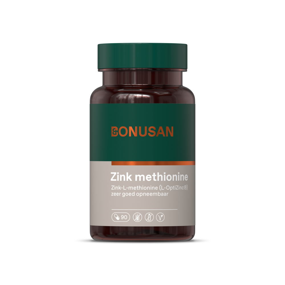 In Bonusan Zinkmethionine is zink gebonden aan methionine. Mineralen zijn altijd, ook in de natuurlijke vorm in ons eten, gebonden aan andere stoffen. Het is dus bij het aanvullen van mineralen niet de vraag óf het mineraal aan een andere stof gebonden is, maar eerder aan welke stof het gebonden is. Hier zitten allerlei redenen achter: je wilt de mineralencompetitie omzeilen, cofactoren inzetten of werkzame stof voorrang geven op andere voedingsstoffen. Dit draagt allemaal bij aan een betere opname van zink in je lichaam.