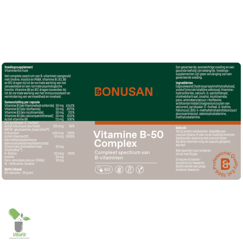 Der Vitamin B-50-Komplex enthält das gesamte Spektrum der B-Vitamine. Darüber hinaus enthält er Inositol, PABA und Cholin. Die B-Vitamine wirken zusammen und sind in ihren einzelnen Aufgaben voneinander abhängig. So sind beispielsweise B1, B3, B8, B11 und B12 für ein gutes geistiges Gleichgewicht von Vorteil. Darüber hinaus sind diese B-Vitamine gut für Stimmung, Konzentration, Gedächtnis und Lernfähigkeit. Die Vitamine B6 und B12 tragen zu einer guten Abwehrkraft bei und unterstützen das Energieniveau. Sie helfen bei Müdigkeit und tragen zur Aufrechterhaltung eines normalen Nervensystems bei. Biotin (B8) schließlich trägt zu normaler Haut und normalem Haarwachstum bei und ist gut für die Schleimhäute.